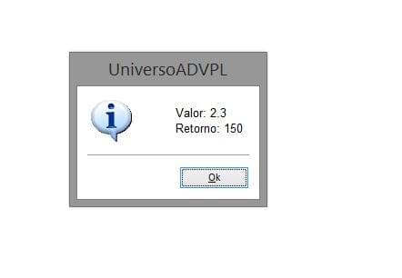 MsgInfo( 'Valor: ' + cValtoChar( cHora ) + CRLF + 'Retorno: ' + cValtoChar( Hrs2Min( cHora ) ), 'UniversoADVPL' )