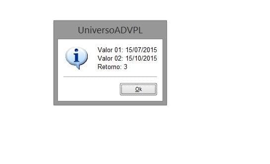+ CRLF + 'Retorno: ' + cValtoChar( DateDiffMonth( dDate01, dDate02 ) ), 'UniversoADVPL' )
