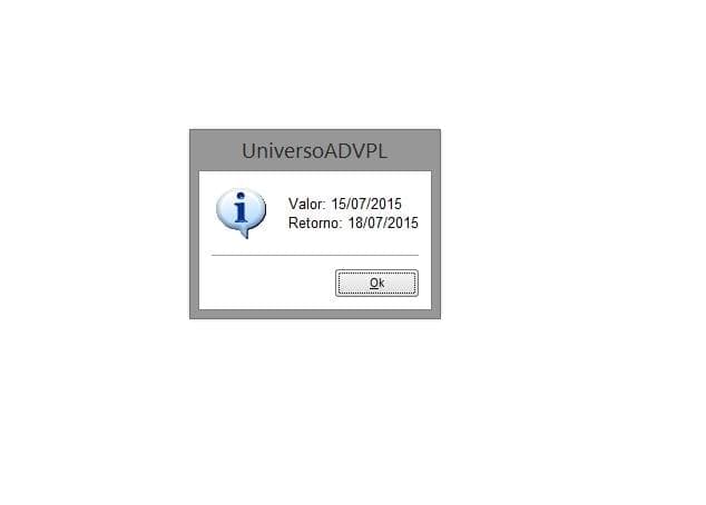 MsgInfo( 'Valor: ' + cValtoChar( Date() ) + CRLF + 'Retorno: ' + cValtoChar( DaySum( Date(), 3 ) ), 'UniversoADVPL' )
