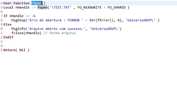 Toda vez que houver um erro na abertura do arquivo, a função FError() pode ser utilizada para retornar o código de erro do sistema operacional. Por exemplo, caso o arquivo não exista, a função FOpen() retornará -1 e FError() retornará 2 para indicar que o arquivo não foi encontrado