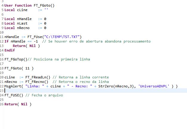 FT_FGoto [AS] - Move o ponteiro, que indica a leitura do arquivo texto, para a posição absoluta especificada no parâmetro <nPos>.