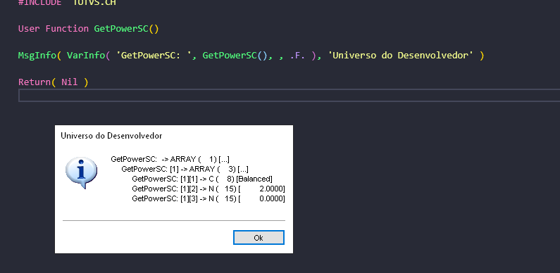 MsgInfo( VarInfo( 'GetPowerSC: ', GetPowerSC(), , .F. ), 'Universo do Desenvolvedor' )