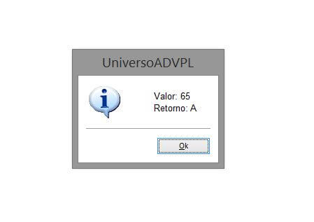 MsgInfo( 'Valor: ' + cValtoChar(nAscII) + CRLF + 'Retorno: ' + Chr(nAscII), 'UniversoADVPL' )