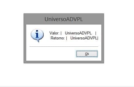 MsgInfo( 'Valor: |' + cTexto + '|' + CRLF + ' Retorno: |' + rTrim(cTexto) + '|', 'UniversoADVPL' )
