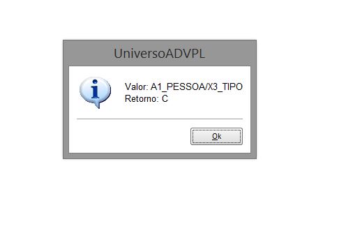 MsgInfo( 'Valor: ' + cCampo+'/'+cInfo + CRLF + "Retorno: " + cValtoChar( GetSx3Cache( cCampo, cInfo ) ), 'UniversoADVPL' )